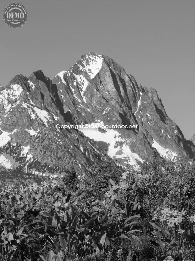 Stunning wildflowers forward the snow covered precipitous slopes of Horstman Peak, Sawtooth Wilderness Fishhook Ridge near Sun Valley, Idaho.  .