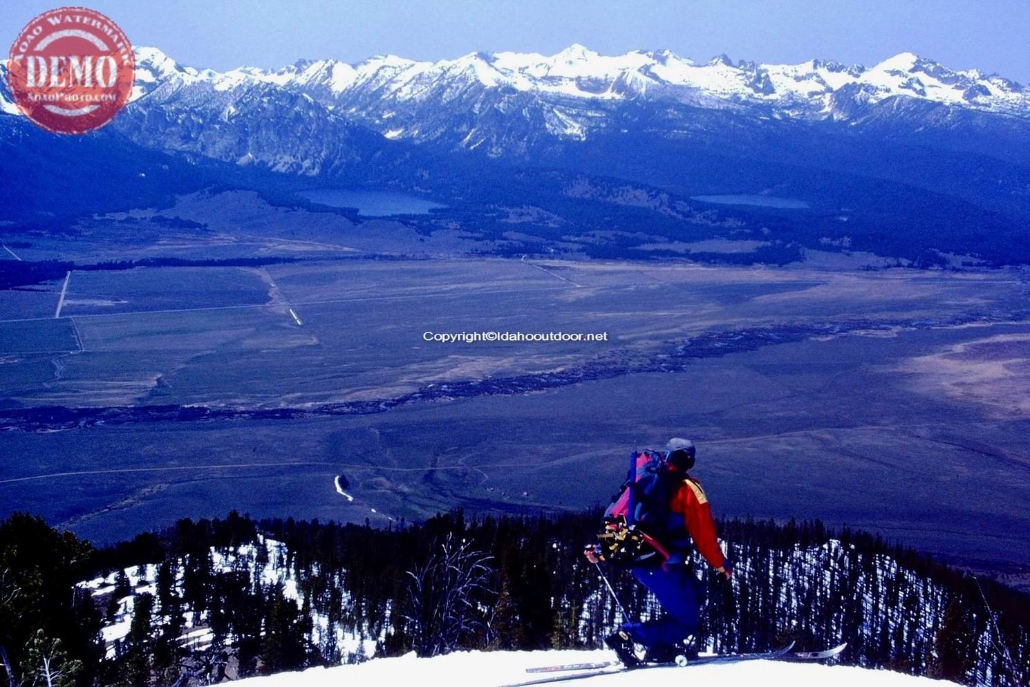 Telemark skier heads off the summit of Horton Peak, White Cloud Mountains of Central Idaho.   Sawtooth Mountains and Alturas Lake dominate the horizon.